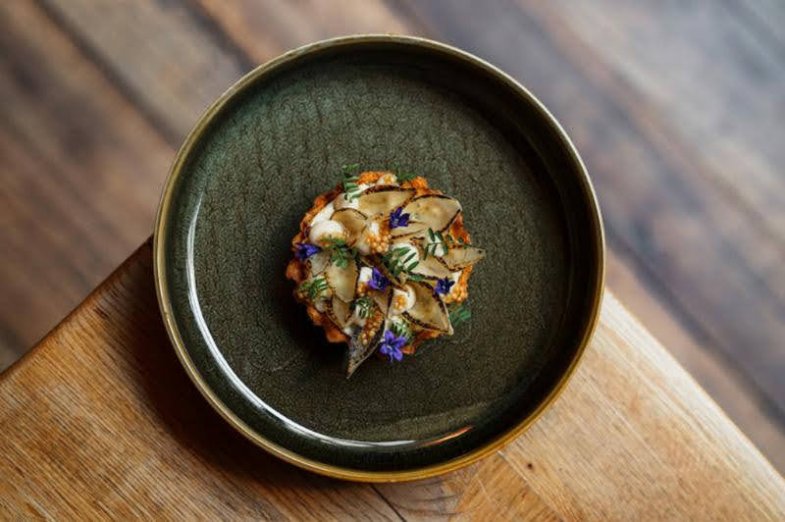 Korálovec ježatý s majoránkovou omáčkou, Shitake pyré a kroupovou kroketou se sýrem Taleggio